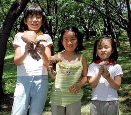 写真は、鑑定会の様子(上)と、この日最大のきのこを採取した姉妹(下)です。