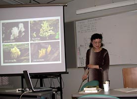 昼食後、今回仙台からキノコ研究家安藤洋子氏をお招きし「ホウキタケにまつわる楽しいお話」と題するセミナーを開きました。このころから内容と講師の魅力に惹かれたためか、徐々に参加者が増加し50名ほどになりました。講師はパソコンからプロジェクターによって写し出される画面を示しながら、蘊蓄を傾けた、しかも分かり易いお話に参加会員一同が大いに啓発されました。