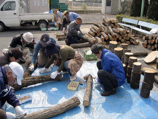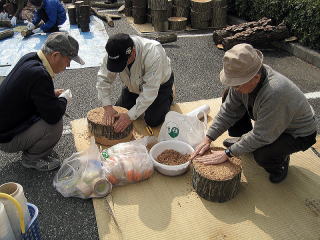当日の天気は曇り時々晴れであったが、すっかり春めいて気温が上がり、作業でいい汗をかいた人が多かったようである。作業終了後は、行田市地域文化セ作業でいい汗をかいた人が多かったようである。作業終了後は、行田市地域文化センターの皆様のご協力により、すいとん、フクロタケ、アミタケ等が入ったきのこンターの皆様のご協力により、すいとん、フクロタケ、アミタケ等が入ったきのこ汁を御馳走になりました。喫食後、橋本世話人より植菌後の原木の管理について、詳しい説明があり、参加者からはナメクジ対策について質問が出ました。ナメクジ汁を御馳走になりました。喫食後、橋本世話人より植菌後の原木の管理について、詳しい説明があり、参加者からはナメクジ対策について質問が出ました。ナメクジ退治は次の方法が良いようです。回答退治は次の方法が良いようです。回答::ナメクジはきのこが好きであり、夜出てきてナメクジはきのこが好きであり、夜出てきて食べる。ビールで退治する方法もあるようであるが、一匹一匹ピンセットなどで取食べる。ビールで退治する方法もあるようであるが、一匹一匹ピンセットなどで取除く方法がよいのではないか。