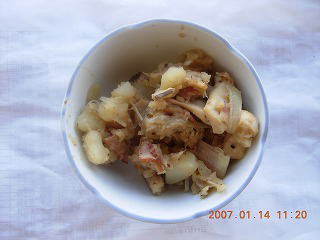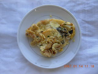 **材料(4人前)**材料(4人前)サンドウィッチ用パン5枚、ヒラタケ1パック、帆立貝柱1缶(または蟹缶)、エシャロット2本、バター20サンドウィッチ用パン5枚、ヒラタケ1パック、帆立貝柱1缶(または蟹缶)、エシャロット2本、バター20gg、卵2個、生クリーム、卵2個、生クリーム200cc200cc、シェリー酒大さじ2、塩・胡椒少々、シェリー酒大さじ2、塩・胡椒少々**作り方**作り方1.1.1.エシャロットはみじん切り。ヒラタケはほぐし、大きいものは1口大に切る。エシャロットはみじん切り。ヒラタケはほぐし、大きいものは1口大に切る。2.2.2.フライパンを熱しバターでエシャロットを炒める。香りが立ったらキノコを入れ中火で炒める。さらに帆立貝柱を加えほぐしながら炒める。シェリー酒を加えアルコール分がとんだら塩・胡椒で調味し冷ます。フライパンを熱しバターでエシャロットを炒める。香りが立ったらキノコを入れ中火で炒める。さらに帆立貝柱を加えほぐしながら炒める。シェリー酒を加えアルコール分がとんだら塩・胡椒で調味し冷ます。3.3.3.ボウルで卵をときほぐし生クリームを加えよく混ぜ塩・胡椒する。これに冷ましたボウルで卵をときほぐし生クリームを加えよく混ぜ塩・胡椒する。これに冷ました22.を加え混ぜ合わせる。.を加え混ぜ合わせる。4.4.4.パイ皿にパンを並べ3.を注ぎ、パイ皿にパンを並べ3.を注ぎ、180180℃に熱したオーブンで℃に熱したオーブンで2525分焼く分焼く**蛇足**蛇足1.1.1.キノコにはウラベニホテイシメジがあれば申し分ない。キノコにはウラベニホテイシメジがあれば申し分ない。2.2.2.帆立貝の代わりに蟹を使っても美味しい。帆立貝の代わりに蟹を使っても美味しい。3.3.3.具の量は多すぎない。炒めた具は充分に冷ます。具の量は多すぎない。炒めた具は充分に冷ます。4.4.4.シェリー酒のない時は白ワインを倍量。シェリー酒のない時は白ワインを倍量。5.5.5.パイを使えばより本格的なキッシュとなる。その場合、冷凍のパイシートを使うと時間が節約できる。パイを使えばより本格的なキッシュとなる。その場合、冷凍のパイシートを使うと時間が節約できる。**3.キノコ入りジャーマンポテト**3.キノコ入りジャーマンポテト