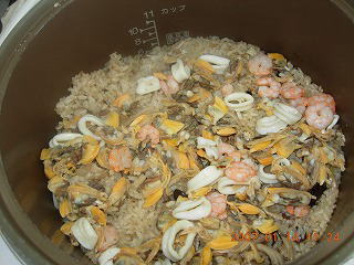 **材料(4人前)**材料(4人前) 米2カップ、玉葱11個、ブナシメジ2パック、生椎茸8個、殻つきあさり300g300g、白ワイン1カップ、ブイヨン2カップ弱、オリーブオイル大匙4、パセリ2本、レモン11個、塩小匙1/21/2、胡椒**作り方**作り方1.1.1.玉葱はみじん切り。ブナシメジは石づきを落としてほぐす。生椎茸は軸をとって傘を2つに切り、軸は薄切りにする。2.2.2.あさりはよく洗って水気を切り、鍋にいれてワイン1/21/2カップをふり蓋をして蒸し煮にする。あさりが口をあいたら取り出し別にしておく。蒸汁は布巾でこしてブイヨンに加え全体で22カップにする。3.3.3.鍋にオリーブオイルを熱し玉葱を炒める。玉葱が透きとおって来たらきのこを加えて炒める。さらに米を加え米が透きとおってくるまで炒める。4.4.4.3.に白ワイン1/21/2カップとブイヨンを注ぎ、塩・胡椒をして強火にかける。煮立ったら弱火にして蓋をして1010分間炊く。炊き上がったら2.のあさりを加えて再び蓋をして3分ほど置く。5.5.5.4.を皿に盛り1.のパセリをふってレモンを飾る。**蛇足**蛇足 キノコにタマゴタケを使うと、サフランを使った時のように全体を黄色く仕上げることができ、味も深みのあるものになる。
