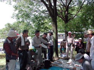 午後一時過ぎから駐車場脇の樹下で、大舘さん、西田さん、午後から参加した福島さんを中心に一時間ぐらいかけて同定をした。それにしても、きのこの発生がないとはいえ、76個の目で探すと結構見つかるもので、50種同定することができた。全体として、キシメジ科、ハラタケ科、オキナタケ科のキノコが見られず、比較的乾燥に強い大型のムレオオイチョウタケや地中深くから出てくるツエタケ、それとベニタケ科、残りの半分くらいが硬いキノコだった。