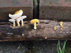 トキイロヒラタケ 撮影 富田 稔**ヌメリガサ科:**ヌメリガサ科:アカヤマタケ、オオヒメノカサアカヤマタケ、オオヒメノカサ**キシメジ科**:カレバキツネタケ、オリーブサカズキタケ、オオイチョウタケ、