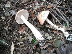 シロホウライタケ属の一種 撮影 西田 誠之 ダイダイガサ 撮影 富田 稔**テングタケ科**:ツルタケ、バライロツルタケ