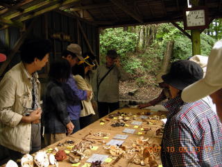 三々五々採集を続け、昼過ぎからは大館さん達により同定と説明が行われました。テングタケの仲間が特に目立ち、ミヤマタマゴタケのアルビノなどもありテングタケ科の特徴とその見方などの説明も「真藤憲政」さんから伺うことができました。