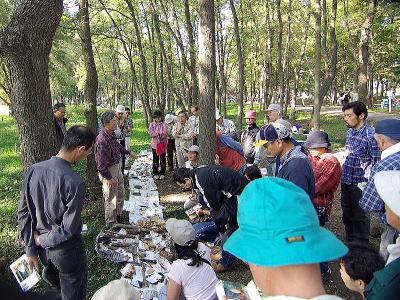 園内の採集種ではハラタケ目は少ないがヒダナシタケ目等が多く、全体としては昨年同期とほぼ同数の43種ほどであった。ちなみに、この10年来園内で新たに見つかった菌類(秋ヶ瀬産新種と言っておく)は昨年10種、今年13種であった。西田氏他4名の鑑定員のご協力によって同定作業が行われ、それぞれ次のような解説がなされた。