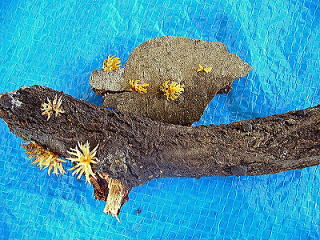 下松原で見られた種としては、マツオウジ、ウラムラサキ、ツエタケ、ヒロヒダタケ、ヒメカバイロタケ、夏タイプとしてはテングツルタケ、ツルタケ、ドウシンタケ、イグチの仲間としてはヌメリイグチが一本と、とても大きなヤマドリタケモドキ、それとアカヤマドリ3本と、チチタケ属はヒビワレシロハツが目に付きました。