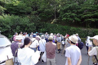 毎年歩いているコースは?イベント広場からお花見広場に向かう道際の林まで伐採されていたが、そこから先は無事だった。 福島会長の挨拶の後、半数ぐらいが吉田さんを中心に車道を下ってから山頂を目指して登ってくるコースで、残り人は公園内を周回するコースでキノコを採集した。