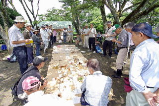 ここ数年の7月第2日曜日の開催では有効積算温度不足から夏のキノコといわれているテングタケ科やイグチ科のキノコがあまり見られなかったので、今年はここ数年の7月第2日曜日の開催では有効積算温度不足から夏のキノコといわれているテングタケ科やイグチ科のキノコがあまり見られなかったので、今年は22週間を遅らせて開催した。週間を遅らせて開催した。福島会長の挨拶の後、地元の会員から下の方がキノコが多いという発言もあり、車道を下ってから山頂を目指して登ってくるコースを取る人、山頂を中心にした公園内を周回する人など三々五々別れてキノコを採集した。私は公園内を周回したが、山頂から下りて最初に目にしたのは落枝に子実体のみならず、菌糸束がびっしり生えたシロホウライタケの仲間だった。車道がすぐ下に見えるところまで降りるとコテングタケモドキが数多く見られた。福島会長の挨拶の後、地元の会員から下の方がキノコが多いという発言もあり、車道を下ってから山頂を目指して登ってくるコースを取る人、山頂を中心にした公園内を周回する人など三々五々別れてキノコを採集した。私は公園内を周回したが、山頂から下りて最初に目にしたのは落枝に子実体のみならず、菌糸束がびっしり生えたシロホウライタケの仲間だった。車道がすぐ下に見えるところまで降りるとコテングタケモドキが数多く見られた。福島会長の挨拶の後、地元の会員から下の方がキノコが多いという発言もあり、車道を下ってから山頂を目指して登ってくるコースを取る人、山頂を中心にした公園内を周回する人など三々五々別れてキノコを採集した。私は公園内を周回したが、山頂から下りて最初に目にしたのは落枝に子実体のみならず、菌糸束がびっしり生えたシロホウライタケの仲間だった。車道がすぐ下に見えるところまで降りるとコテングタケモドキが数多く見られた。今回はタマノリイグチが採集されたのが収穫だった。鑑定は大館、西田、福島の今回はタマノリイグチが採集されたのが収穫だった。鑑定は大館、西田、福島の33人で行った。人で行った。講評では、福島からはタマノリイグチ、ルスラ・ヘテロフィラ、ニクウチワタケについて言及があった。大館からは幼菌のときのニクウチワタケの幼菌がなかなかニクウチワタケとは思い至らなかったという話があった。西田は試薬を用いた呈色反応による種の同定について話した。講評では、福島からはタマノリイグチ、ルスラ・ヘテロフィラ、ニクウチワタケについて言及があった。大館からは幼菌のときのニクウチワタケの幼菌がなかなかニクウチワタケとは思い至らなかったという話があった。西田は試薬を用いた呈色反応による種の同定について話した。**確 認 種**確 認 種**キシメジ科:**カレバキツネタケ、サマツモドキ、オリーブサカズキタケ、