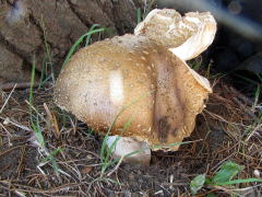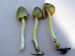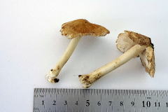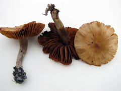 外見的に見分けやすいポイントは、柄が中実(〜髄状)で根元が細まり、橙色がかって下部程濃色になるのが、大きな特徴です。ヒダにも橙色が見られます。また傘の色が乾くと灰色っぽくなり、冴えない薄い土気色(ベージュ色)になります。成菌になると大概このような色合いになるので、採取した時、濃い茶褐色のキノコとは感じません。