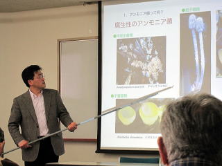 吹春氏の埼玉きのこ研究会での講演は、今回で二回目である。寒い日にも拘わらず、吹春氏の埼玉きのこ研究会での講演は、今回で二回目である。寒い日にも拘わらず、2727名の参加のもと開催された。最近話題の同氏の著書『きのこの下には死体が眠る名の参加のもと開催された。最近話題の同氏の著書『きのこの下には死体が眠る!?!?』の中から、特に**「アンモニア菌のこと」**をテーマに絞って講演して戴いた。
