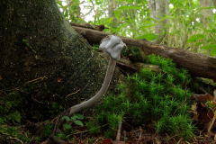 以前ここに来てホテル脇に林道の入り口を、発見しておいたのだ。とにかく初日は何も考えずに真っ直ぐこのホテルを目指した。裏山に入ってみると入り口付近はなだらかで、ぽつぽつきのこも散見できた。してやったりと思ったところが林道をしばらく進ん行っても、峻険できのこの観察をできそうな場所は無い。早々に引き返し今度は尾根筋をカラマツがあるところまで登ってみたがチシマザサが密生していて藪こぎが並大抵ではなく、無駄な努力を重ねて降りてきた。しかしこれで夕食のビールがひときはおいしくなったのは事実だ。そこでお昼になったので弁当を車のそばで食べ終わったろ降りだしたのである。