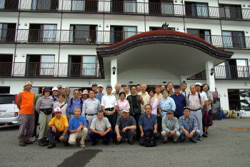 フロントに一時避難していると、一時間ほどで雨が上がったので、今度はホテルの前の園地風の林内で観察をしてみた。さしたる成果も無く玄関前に来ると、県北グループが例のごとくチチタケをしっかりと確保してやってきたと思うと、川越グループが意気揚々と登場し、沢山の収穫物が車の荷台に積んである。其の観察をゆっくりする間もなく、今度は雷鳴がとどろきひときわ激しい夕立にあった。