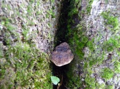 そしてさらに少し下った処で、本日、一番特筆したい発見があった。登りには気付かなかったが、登山道傍のブナの一樹の腐朽部に、柄のあるきのこが束生し