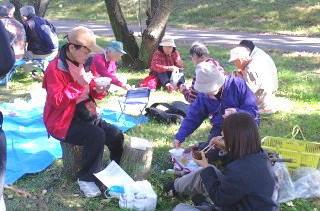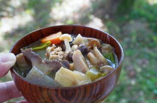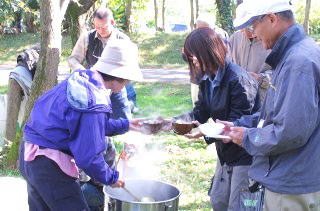そんなわけで多少興ざめの観察会にあって、違った意味の楽しみである「キノコ汁」を食べながらの昼食・歓談となった。