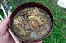 ⑥現場で、生キノコを追加するので、最後は醤油で味を整える