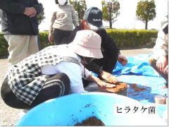 自宅のクリーンベンチと研究所のクリーンベンチを使い、2月12日(火)と13日(水)に接種しました。シロヒラタケ8ポット、ヒラタケ6ポット作成し、残りの7本のハチミツビンにはヒラタケを接種しました。2,7ℓ(NKポット)は、18ミリ試験管を5本立てて滅菌し、接種する時に試験管を抜きながら行うと、底の部分まで接種できるので菌廻りが速く、25℃、10日間で完全に菌糸が回りました。ヒラタケやナメコ種菌用の増量オガクズ等は、3月15日(金)と3月16日(土)に乾燥ブナオガクズ30ℓに10ℓのフスマを混ぜ、含水率72%程度にし、121℃70分滅菌したものを使いました。ヒラタケやナメコ種菌用の増量オガクズ等は、3月15日(金)と3月16日(土)に乾燥ブナオガクズ30ℓに10ℓのフスマを混ぜ、含水率72%程度にし、121℃70分滅菌したものを使いました。 きのこの会が発足してから、長い事栽培に携わって来ましたが、皆さんの協力で続ける事が出来ました。原木を伐採し、日陰で水抜きをし、前日に細かく玉切り、植菌器具や原木を全て会場に運搬、売れ残った物や道具の片付け等、何時もの事ながら担当責任者の方は大変な思いをなされているものと恐縮しています。 きのこの会が発足してから、長い事栽培に携わって来ましたが、皆さんの協力で続ける事が出来ました。原木を伐採し、日陰で水抜きをし、前日に細かく玉切り、植菌器具や原木を全て会場に運搬、売れ残った物や道具の片付け等、何時もの事ながら担当責任者の方は大変な思いをなされているものと恐縮しています。きのこの栽培は、生き物を飼う心が必要です。