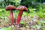 ◎アシベニイグチは根元付近と傘の付け根が赤い。カットするとゆるく青変する。