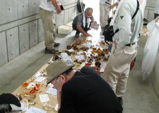 今年は今年は2222日頃梅雨明けした。その後猛暑の日が続き、当日も朝から強い日差しであった。日頃梅雨明けした。その後猛暑の日が続き、当日も朝から強い日差しであった。森の中は日陰であっても、風がなく少し動くだけでも汗が噴き出してくる。数種類のキノコを採取して私は早々と鑑定会場へ引き上げてしまった。予定では森の中は日陰であっても、風がなく少し動くだけでも汗が噴き出してくる。数種類のキノコを採取して私は早々と鑑定会場へ引き上げてしまった。予定では1212時までであったが、まだ時までであったが、まだ1111時を回ったばかりである。美の山の山頂広場は木陰にベンチがあり風も通るので、再度採取に向かう気にはなれず、他の人も早めに戻るであろうと、このまま待つことにした。しかし皆熱心でほとんどの人が定刻まで採集していた。時を回ったばかりである。美の山の山頂広場は木陰にベンチがあり風も通るので、再度採取に向かう気にはなれず、他の人も早めに戻るであろうと、このまま待つことにした。しかし皆熱心でほとんどの人が定刻まで採集していた。 昼食を済ませ各自が採取したキノコを並べはじめていると、午後から雷雨との予報があったのは承知していたが、北の空を見ると積乱雲が発達しはじめている。鑑定会は 昼食を済ませ各自が採取したキノコを並べはじめていると、午後から雷雨との予報があったのは承知していたが、北の空を見ると積乱雲が発達しはじめている。鑑定会は11時からの予定であったが、時間を繰り上げ、また場所も公園管理棟隣のインフォメーションセンターを使用させてもらうことにした。移動が終わり再び採集したキノコを並べ始めていると雨が降りだしてきた。ほっとしている間もなく雨風とも強まり、ドアから外を覗くと猛烈な暴風雨となっている。落雷も山頂ということもあり集中砲撃でもあびているように間近で続き、ついに直撃を受け停電となってしまった。瞬間天井の照明器具付近から火花が落ちてきた。当たり前だが直撃は光と音が同時で雷鳴も響くことはない、ビックリはするが恐怖感はあまりない。雷を怖いと思うのは光と音がずれ、その音が大きくなったり小さくなったり、長く響いたりと居場所が特定できないことにある。ここの管理人によると、この美の山は周りに連なる山がないので雷はしばらくこの付近で遊んでいくとのことだ。時からの予定であったが、時間を繰り上げ、また場所も公園管理棟隣のインフォメーションセンターを使用させてもらうことにした。移動が終わり再び採集したキノコを並べ始めていると雨が降りだしてきた。ほっとしている間もなく雨風とも強まり、ドアから外を覗くと猛烈な暴風雨となっている。落雷も山頂ということもあり集中砲撃でもあびているように間近で続き、ついに直撃を受け停電となってしまった。瞬間天井の照明器具付近から火花が落ちてきた。当たり前だが直撃は光と音が同時で雷鳴も響くことはない、ビックリはするが恐怖感はあまりない。雷を怖いと思うのは光と音がずれ、その音が大きくなったり小さくなったり、長く響いたりと居場所が特定できないことにある。ここの管理人によると、この美の山は周りに連なる山がないので雷はしばらくこの付近で遊んでいくとのことだ。十二支の中に唯一架空のものである竜を入れた本当の理由は分からないが、先人たちの想像力が他の動物と同じように身近に感じていたのかもしれない。十二支の中に唯一架空のものである竜を入れた本当の理由は分からないが、先人たちの想像力が他の動物と同じように身近に感じていたのかもしれない。十二支の中に唯一架空のものである竜を入れた本当の理由は分からないが、先人たちの想像力が他の動物と同じように身近に感じていたのかもしれない。福島会長をはじめ鑑定人たちは外の状況など気にもせず、まさにどこ吹く風という感じで淡々と同定カードに名前を記していった。同定された種は福島会長をはじめ鑑定人たちは外の状況など気にもせず、まさにどこ吹く風という感じで淡々と同定カードに名前を記していった。同定された種は7171種、内種、内1616種が新規確認種で、やはりテングタケ科、ベニタケ科、イグチ科などの夏型のキノコが多く並んだ。種が新規確認種で、やはりテングタケ科、ベニタケ科、イグチ科などの夏型のキノコが多く並んだ。講評は西田氏がイグチ類について解説され、今回たくさん採取されたヒイロウラベニイロガワリは比較的に標高の低い里山に出て、ここ美の山と高尾山で確認している。アメリカウラベニイロガワリは柄に網目がなく基部は黄色い毛に覆われるのが特徴である。チャニガイグチと似ているクリイロニガイグチはよく見られるが図鑑にはあまり出てない、違いは柄の網目の有無であるなど。講評は西田氏がイグチ類について解説され、今回たくさん採取されたヒイロウラベニイロガワリは比較的に標高の低い里山に出