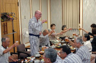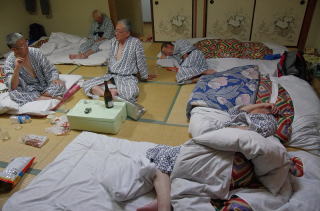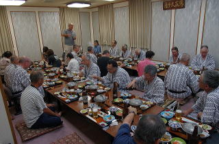 3時過ぎに宿についてみると、おどろくべき光景があった。駐車場の片隅でなんと、ざる一杯のマツタケを前にして既に出来上がっている一団がいる。聞けば用意したフライパンでホイル包みにしてマツタケを焼き、それを肴に祝杯を挙げたのだという。