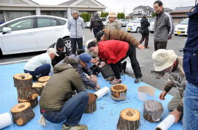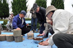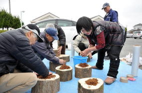 太い原木にはオオヒラタケを塗りましょう 太い原木にはオオヒラタケを塗りましょう ヒラタケ菌が最後ですね ヒラタケ菌が最後ですね サンドイッチが完成 サンドイッチが完成今年度は椎茸、ヒラタケ、トキイロヒラタケ、ヤナギマツタケ、オオヒラタケ、シロナメコの6種類を接種しました。栽培用原木は、橋本稔さんが準備してくれました。また、前日に橋本さん達がシイタケ用コナラ原木を運び込み、短木再培養のシデ、ヤナギを玉切ってくれました。種菌は福島が準備しました。9時30分から作業の説明と諸注意の話をした後、受付の確認、集金等の話をしました。作業の流れは以下の通りです。**①**①**シイタケの原木栽培**シイタケの原木栽培シイタケの駒打ち作業は、皆さん慣れており3030分程で用意した8080本のコナラ原木に接種を完了しました。②**短木栽培は表1の1~5の順に作業を行いました。**短木栽培は表1の1~5の順に作業を行いました。トキイロヒラタケ、シロナメコ、ヤナギマツタケ、オオヒラタケは、初めて栽培を行うため、皆さんの関心が強く楽しみな様でした。イヌシデやヤナギ等の両面にオガクズ種菌を塗りました。今年度から会員の村田さんが作成してくれたオガクズ種菌接種専用ベルトを使い作業しました。トキイロヒラタケ、シロナメコ、ヤナギマツタケ、オオヒラタケは、初めて栽培を行うため、皆さんの関心が強く楽しみな様でした。イヌシデやヤナギ等の両面にオガクズ種菌を塗りました。今年度から会員の村田さんが作成してくれたオガクズ種菌接種専用ベルトを使い作業しました。表表1菌種菌種樹種・本数樹種・本数平均太さ(平均太さ(cmcm))平均高さ(平均高さ(cmcm))1トキイロヒラタケトキイロヒラタケイヌシデイヌシデ2020本本2020~~30202シロナメコシロナメコイヌシデイヌシデ2020本本2020~~30203ヤナギマツタケヤナギマツタケヤナギ ヤナギ 1515本本2020~~30204オオヒラタケ、オオヒラタケ、イヌシデイヌシデ2020本本2020~~30205ヒラタケヒラタケイヌシデイヌシデ1515本本