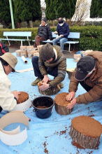 次はトキイロヒラタケ菌だね 次はトキイロヒラタケ菌だね イヌシデにトキイロヒラタケ菌を塗るよ イヌシデにトキイロヒラタケ菌を塗るよ 今日は寒いねー 今日は寒いねー
