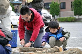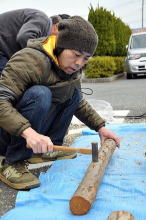 シイタケ菌は良い香りでしょう シイタケ菌は良い香りでしょう パパと一緒に駒打ちだ! パパと一緒に駒打ちだ! だいぶ慣れてきたよ だいぶ慣れてきたよ
