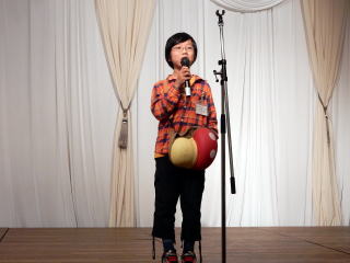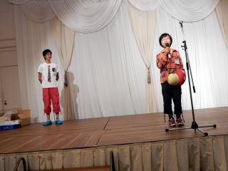 堂々と抱負を述べる山下光君堂々と抱負を述べる山下光君女装で応援する大前宗之氏女装で応援する大前宗之氏