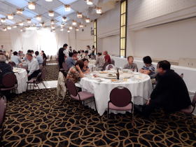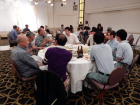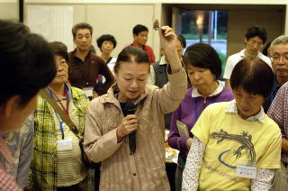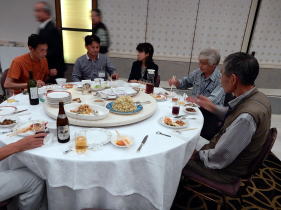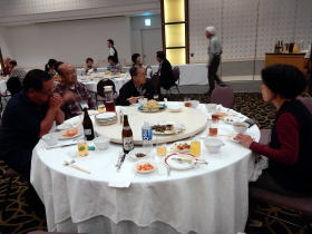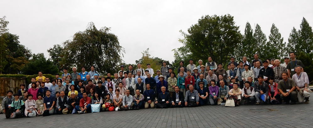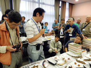 会場には、愛知県の田中朝嶺顕彰会代表中條長炤氏が持参された、本邦菌類研究の草分けである田中朝嶺に関する貴重な資料の展示もあり、中條代表の説明も聴くことが出来ました。また、片隅には、当会の会報「いっぽん」各号が並べられていましたが、それに見入る人もありました。夕刻には、温泉入浴もそこそこに、恒例の懇親会が始まり、大いに盛り上がりました。来賓として、森林公園、都市緑化植物園長の坂部高矢様もお出で下さり、心暖まる挨拶をして下さいました。舞台には、若い研究者や将来の菌学者の卵達等が次々とあがり、きのこへの思いのこもったパフォマンスを演出してくれました。各種の銘酒、ホテルの丁寧な料理はもとより、当会特製のきのこ汁も大好評で、お代わりをされる方が続出しました。終了後は温泉で疲れを癒した後、遅くまで、きのこへの思いを語り合った参加者も多かったようです。夕刻には、温泉入浴もそこそこに、恒例の懇親会が始まり、大いに盛り上がりました。来賓として、森林公園、都市緑化植物園長の坂部高矢様もお出で下さり、心暖まる挨拶をして下さいました。舞台には、若い研究者や将来の菌学者の卵達等が次々とあがり、きのこへの思いのこもったパフォマンスを演出してくれました。各種の銘酒、ホテルの丁寧な料理はもとより、当会特製のきのこ汁も大好評で、お代わりをされる方が続出しました。終了後は温泉で疲れを癒した後、遅くまで、きのこへの思いを語り合った参加者も多かったようです。((22日目)日目)翌日の観察日当日は、一番気になっていた前日からの雨も降り止み、穏やかな日和となり、観察者全員が予定通りバスに分乗して、大挙して森林公園に向かいました。翌日の観察日当日は、一番気になっていた前日からの雨も降り止み、穏やかな日和となり、観察者全員が予定通りバスに分乗して、大挙して森林公園に向かいました。当会会員当会会員3030名が名が55グループに分散、先導して、入園、その後は、各自目当てのきのこを求めて、観察、採集に専念しました。
