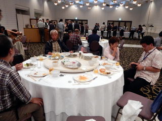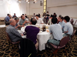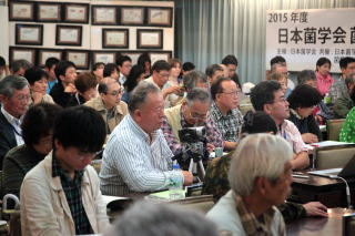 ープ総合センター)*資料提供:「*資料提供:「20142014年までの宮城県自生キノコの放射能汚染の動向」年までの宮城県自生キノコの放射能汚染の動向」 木野康志・入澤歩 木野康志・入澤歩問題提起、今後の課題について問題提起、今後の課題について保坂健太郎(国立科学博物館)保坂健太郎(国立科学博物館)1212::0000 実行委員会解散 実行委員会解散 全日程終了 全日程終了 (*敬称はご来賓のみにて記載しました)(*敬称はご来賓のみにて記載しました)―――主要行事概観―主要行事概観―(初日)(初日)宿泊場所になったホテルヘリテイジには、初日から、折からの本降りの雨にも拘わらず、宿泊場所になったホテルヘリテイジには、初日から、折からの本降りの雨にも拘わらず、100100名を超える参加者が参集されました。開会式でご来賓の祝辞を戴いた後、すぐに講演会に入り、満席の会場で、福島隆一、吹春俊光、両氏の有意義な講演、「日本産ハナビラタケの生物学的種について」および「糞生菌やアンモニア菌類等について」を熱心に聴講しました。お二人とも映像を駆使して、自ら体験した研究内容を発表され、その感銘深い内容に終了後も質問が相次ぎ、時間が足りないことが痛感されました。