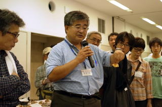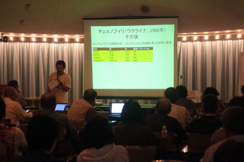放射能汚染の問題を提起し、セミナーを進行する保坂健太郎氏( 放射能汚染の問題を提起し、セミナーを進行する保坂健太郎氏(TYTY))*映像撮影者について*映像撮影者について本稿作成にあたり、本フォーレの共催団体である菌類懇話会の種山裕一様、種山美香様、小山明人様、谷口雅仁様、井本敏和様、幼菌の会の波部健様、神奈川きのこの会平野達也様より、特別の御計らいを戴き、貴重な写真を提供して戴きました。ご厚情に深く感謝申し上げます。本来ならば、逐一お名前を記載すべき処、紙面の都合により、多数ご提供戴いた種山裕一様、種山美香様、平野達也様においては、初出以降は、()内に、それぞれ、(本稿作成にあたり、本フォーレの共催団体である菌類懇話会の種山裕一様、種山美香様、小山明人様、谷口雅仁様、井本敏和様、幼菌の会の波部健様、神奈川きのこの会平野達也様より、特別の御計らいを戴き、貴重な写真を提供して戴きました。ご厚情に深く感謝申し上げます。本来ならば、逐一お名前を記載すべき処、紙面の都合により、多数ご提供戴いた種山裕一様、種山美香様、平野達也様においては、初出以降は、()内に、それぞれ、(TYTY)、()、(TMTM)、()、(HTHT)と記載させて戴きました。ご無礼の段、何卒、お許しください。)と記載させて戴きました。ご無礼の段、何卒、お許しください。その他の映像は、大舘一夫、長谷川明(その他の映像は、大舘一夫、長谷川明(HAHAと表示)両会員がB地区を、大久保彦会員(と表示)両会員がB地区を、大久保彦会員(OHOHと表示)がと表示)がCC地区と同定会の一部を、吉田考造会員(無印)がⅮ1地区を、及び西田誠之(無印)が、その他全般を撮影しました。 (以上報告 西田 誠之 記地区と同定会の一部を、吉田考造会員(無印)がⅮ1地区を、及び西田誠之(無印)が、その他全般を撮影しました。 (以上報告 西田 誠之 記)