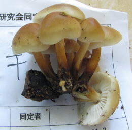 今回、ヒダの色が黄色く、柄に垂生する**キヒダナラタケ**(仮名)が見られました。平地でも、山間部でも