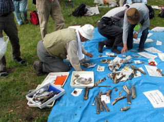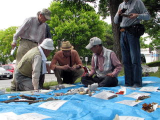 (実施日までの経緯) 今年も、年初の野外観察会として、川越周辺の平地林を探索する本観察会を実施することになった。当会、創設以来、毎年この梅雨の時期に実施しているが、いつも、懸念されるのが、雨が降った場合の同定場所のことである。採集して来た多くのきのこを置き並べて鑑定するためには、どうしても屋根のある場所が必要となる。その為、集合場所である川越公園に事前に依頼して、一般には開放されていない広いシェルターのある場所を特別に開放して戴くようお願いして来た。今年も同公園のご好意でその許可を戴いたのだが、ただ、66月の最終の土、日曜日だけは、業務で使用するので開放出来ないとのことだった。その為、役員で協議した結果、当観察会を、例年より11週早く実施することになった。これで今年も雨天時の対策はできたが、しかし、今度は、1週早い実施のゆえに、肝心のきのこの出方が、どうか、それが心配である。66年前の20112011年にも、同時期に実施しているが、こうなった以上、空梅雨では困る、、むしろ、「雨よ降れ、降れ」と願っていた。しかし、雨は殆ど降らず、55月中旬から天地とも乾ききって、早くも列島を3030℃超の「真夏日」が蔽う始末。関東も例外ではなく、早々に「猛暑の日々」となってしまった。地球規模の温暖化の影響は、確実に当地にも及んでいると言わざるを得ない。6月88日には「関東地方も梅雨入り」の報が出たが、しかし、相変わらず、願っているようには雨が降らない。ようやく、実施日の55日前にかなりの雨が降ったが、しかし、すぐにまた再び暑い日差しが戻り、地表はすっかり乾いてしまった。大久保彦氏と直前に下見をしたが、やはり,,菌影薄く、期待できるのは材上生のきのこぐらいだった。トキイロヒラタケや、ウラベニガサ、ベニヒダタケ等、中でもアミスギタケが大量に出ていた。しかし、菌根菌は、なかなか見出だせなかった。66年前の同時期の観察会では、115115種ものきのこが記録されているのだから、参加の皆さんの「探索力」「たしかなきのこ目」に期待しよう、、と話あって、早々に、その日は切り上げた。 (実施日)66月1313日以後も、44日間、雨が降らないまま、この日を迎えた。88時前に、集合場所の川越公園に着いて、すぐに公園事務所に挨拶に行った。落ちついた曇り日で、爽やかな朝だった。しかし、「午後から雨もあり」との天気予報なので、「シェルターが必要か、どうか、微妙ですね、、」と係官が気遣いをして下さった。駐車場は、既に驚くほど多くの車で溢れていた、バザーか何かの催しがあるらしい。駐車場が広大なのと我々の集合位置が離れているのが、幸いだった。すでに大久保さんや、緑川さん等が先着されており、程なく、本日の参加者全員が集合された。常連の皆さんばかりだが、事前に、急用等で参加できなくなった方もあり、いつもより少ない人数だった。藤野さんは、同定時に使用するシーツをここへ届けて後、すぐに診療に向かったとのこと。福島会長の到着を待って、しばらく歓談しながら過ごした後、大舘副会長に開始の挨拶をして戴き、世話役の大久保氏と私が簡単に、本日の手順等を説明した。その後、すぐに手分けして観察地に向かった。観察地は、恒例の22か所の他、智光山公園を加えて、3カ所に設定した。(観察地にて) 私は、下松原地区へ行き、近藤さんや、宮井さん、篠崎さん、また現地で待っておられた稗島さんと一緒に歩いて観察した。森の中はしっとりとして爽やかだった。少ないと思っていたきのこが、丹念に探すと見つかるので、安堵した。地中に埋もれた腐朽木や落ち葉等を探ると菌糸がびっしり張り付いていた。すぐに、その腐朽木にハイイロイタチタケが生えているのを手にした。20002000年に、高橋春樹さんが新種発表したきのこである。以前は、よく見つけたきのこだが、久しぶりに手に取った。こうしたきのこは、目立たないので、きのこが多い時は見過ごしているのだろう。その後も、常連のイヌセンボンタケや、よく見かけるが名前の解らないシロホウライタケ属の1種と思う微小菌や、ヒロハアマタケかオオミノアマタケか、等と思われる菌が見られた。こうした繊細なきのこは、新聞紙等でくるんで、持ち帰る等と言うことは出来ない、結局、ハイイロイタチタケだけを、近藤さんの収納容器に入れて貰った。この時期、そういう用意をして来なかったのが愚かである。 その後、目に留まったり、手にとったりしたきのこは、材上生の、いわゆる「硬いきのこ」と呼んでいる頒布種が殆どだった。それらは揃って、至る所に生えていた。チャウロコタケ、アラゲカワラタケ、ミダレアミタケ、チャカイガラタケ、エゴノキタケ、クジラタケ、ホウロクタケ、ネンドタケ、ネンドタケモドキ、ヤケイロタケ、カワラタケ、ハカワラタケ、シハイタケ、ツヤウチワタケ、ツヤウチワタケモドキ、ヒイロタケ等々、この雑木林では、1年中見られる木材分