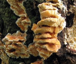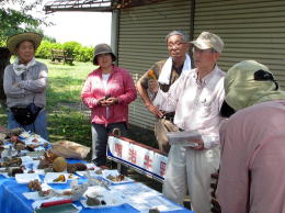 講評は福島会長が硬質菌類を主に解説され、ニクウチワタケは木から生えてくるものと地面から出るものとではちょっと感じが違う。ベッコウタケは日本産とヨーロッパ産は別種ではないかと言われていて、前者は木を枯らすが後者は枯らさない。桜やハリエンジュの木の根元に発生し心材を綿腐れさせるとのこと。また私が採取してきた細い毛のようなものはシロホウライタケの根状菌糸束だろうとのことで、ナラタケなどはもっと太い毛になりその菌糸束の役割について説明して下さった。続いて西田氏がイグチ類について解説し、ヒイロウラベニイロガワリは広葉樹林の標高の低い山で見られ、似ているバライロウラベニイロガワリは富士山など亜高山帯の針葉樹林に発生する。図鑑によく出ているアメリカウラベニイロガワリは日本にはないとのこと。最後に近藤氏が冬虫夏草にについて解説された。講評は福島会長が硬質菌類を主に解説され、ニクウチワタケは木から生えてくるものと地面から出るものとではちょっと感じが違う。ベッコウタケは日本産とヨーロッパ産は別種ではないかと言われていて、前者は木を枯らすが後者は枯らさない。桜やハリエンジュの木の根元に発生し心材を綿腐れさせるとのこと。また私が採取してきた細い毛のようなものはシロホウライタケの根状菌糸束だろうとのことで、ナラタケなどはもっと太い毛になりその菌糸束の役割について説明して下さった。続いて西田氏がイグチ類について解説し、ヒイロウラベニイロガワリは広葉樹林の標高の低い山で見られ、似ているバライロウラベニイロガワリは富士山など亜高山帯の針葉樹林に発生する。図鑑によく出ているアメリカウラベニイロガワリは日本にはないとのこと。最後に近藤氏が冬虫夏草にについて解説された。