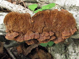 採集は志村、清水両氏と3人で車で少し移動し中腹の斜面を歩いてみた。前夜に少しまとまった雨があったようで、地面は程よい湿り加減ではあるのだが、硬質菌類が少あるくらいで傘と柄のあるきのこの姿はいくら歩いても一向に見当たらない。しばらくして同行の清水氏がこの山ではよく出るヒイロウラベニイロガワリをやっと一本見つけた。その後採集は志村、清水両氏と3人で車で少し移動し中腹の斜面を歩いてみた。前夜に少しまとまった雨があったようで、地面は程よい湿り加減ではあるのだが、硬質菌類が少あるくらいで傘と柄のあるきのこの姿はいくら歩いても一向に見当たらない。しばらくして同行の清水氏がこの山ではよく出るヒイロウラベニイロガワリをやっと一本見つけた。その後11時間半ほど歩いてみたがベニタケ属と、ニガイグチの仲間を1個体ずつと、山姥の髪の毛と言われたりしている細い毛のようなものが付いた枯れ枝や硬質菌を採取し、鑑定会場に向かうことにした。時間半ほど歩いてみたがベニタケ属と、ニガイグチの仲間を1個体ずつと、山姥の髪の毛と言われたりしている細い毛のようなものが付いた枯れ枝や硬質菌を採取し、鑑定会場に向かうことにした。