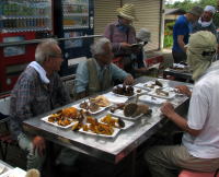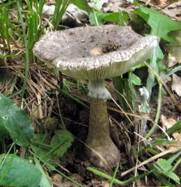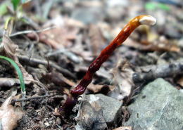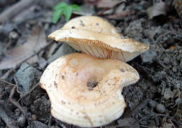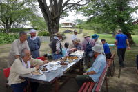 この1010日間ほど降雨がなく、猛暑が予想されたせいか参加者が少なかった。開会の挨拶と熱中症に対する注意の後、大部分の参加者は山頂付近の乾燥具合を見て、きのこが生えている可能性が高い谷筋を探すべく、車で下へ向かった。私と福島会長は尾根筋を歩いたが、やはり柔らかいキノコが見当たらないので、山頂を越した所から北斜面に降りた。稜線から5050㍍も下った所では土に湿り気が感じられ、コビチャニガイグチらしきものが数本生えていた。さらに下るとテングタケの仲間がぽつりぽつりと生えていた。そのあとあじさい園の下の道の先に出て、ケショウハツの群落を見つけて撮影し、観察を切り上げた。 鑑定台の上にはコガネヤマドリをはじめとするイグチ科のキノコが一番多く並び、次いで数は少ないもののテングタケ科、ベニタケ科のキノコが並んだ。