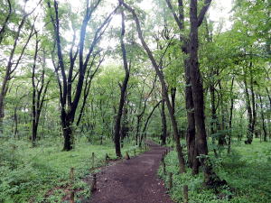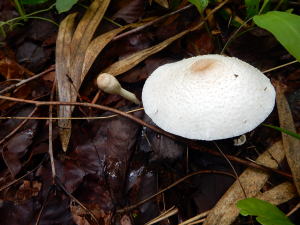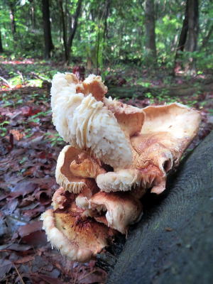 **(実施日までの経緯)**(実施日までの経緯)令和元年、最初の野外観察会として、今年も、川越周辺の平地林を探索する本観察会を、実施することになった。当会発足以来、ほぼ毎年、この時期に、同じ場所で実施しているが、観察地の森は、その一部の公園の敷地内はもとより、広大な私有地の林地も綺麗に手入れがされており、数十年間、殆ど変わることなく、保存されている。地主の方々の努力や、ボランテイアの協力もあってのことと思われるが、有難いことである。今年も変らず多くのきのこが観察可能と期待しながら、新しい元号が発表されるのを待った。いざ発表されて見ると、典拠となったのが私の座右の愛読歌集!でもあり、詠まれたその場所(太宰の官の師、大伴旅人の館跡)も、官人達が膝を突き併せて大酒を飲み交わしたその場面も、よく知っている万葉集巻五の梅見の宴の11節から、「令和」となったことに、大いに気を良くした。私は、この序文に出てくる「天を蓋((きぬがさ))とし、地を坐(しきい)にし、膝を促して盃を飛ばす」という11節が気に入り、かって「天蓋山」という山、岐阜県の僻地、その名も山之村という地にある標高15271527mの山を探し出し、遙々登りに行ったことがある。全くの静寂、無人の山であったが、北アルプスを始めとする頂上の絶景もさることながら、何と言っても、きのこが多いこと、多いこと、呆れるほどの大収穫であった、、、新元号が発表されたとたん、その日のこと、手にした美味なきのこのことが、まざまざと思いだされた、、。しかし、その後が芳しくなかった。個人的なことなので論外だが、その後次々とろくでもない事が続き、体調を崩した。考えて見れば、もはや7676歳、新しい元号は、まちがいなくこれが最後であろう、、祝賀ムード一色の中で、やや憂鬱な55月を過ごした。加えて、気候も異常、、早々と関東地方も梅雨入り宣言が出たが、いきなり超高温の日々、全国規模で連日の猛暑続き、遂に北海道帯広迄が3535℃超えの暑さ、、もはや、当たり前なのか、気象庁の発表も、もはや慣れっこのような「観察史上初、高温記録更新」との報道が連続した。66月になると、ようやく少し落ち着き、梅雨らしい涼しい日々が続いた。すぐに、大久保彦さんからもきのこの便りがあった。励まされて、一度、一人で下見に行ってみた。しかし、その後も体調が戻らず、実施日の数日前から、発熱、嘔吐、絶食で、遂にダウン、、、。大きな病院に行って診察を受けると首のレントゲン迄撮られた。やむなく、欠席を覚悟して、大久保さんや栗原さんに、当日の準備や進行をお願いして、数日臥したまま、実施日を迎えた。目覚めてみると、幸い、熱は引いていた。携帯電話をみると種々着信が入っていた。やはりこのまま休む訳には行かない、、。何とか、起きだして、マスクと帽子で顔を隠して、ボロ車のハンドルを握った。77時過ぎに管理事務所についてみると電話で応対して下さった管理官がもう出勤されていた。ご挨拶すると、「申し訳ないが、、」とのことで、降雨に備えて提供して下さる筈だった施設が急に使用されることになり、代わりに、事務所裏手の屋根のある場所を用意したとのこと。そして、事務所の廊下の窓から、その場所を、丁寧に指し示して下さった。いつも乍ら、有難いことで、伏して御礼を述べた。空模様は、晴れ間はまったく見えないが、全面高曇りで午前中の観察採集には、支障がなさそうである。しかし、朝の予報では、前日より悪くなっており、午後は埼玉地方は、すべて雨となっていた。開始時刻前の88時には、ほぼ予定の方々が参集された。初参加の新入会員の方や、一日会員の方も早くから来られていた。88時3030分迄待ってから、行事を開始した。大舘副会長は、直接観察地へ行かれたとのこと。福島会長もそのようである。近藤副会長の挨拶の後、大久保さんや藤野さんから、予定や注意事項を説明してもらった後、早々に観察現地へ出発した。今年は、智光山公園への希望者はなく、赤坂の森公園も少数で、下松原地区への希望者が多かった。**(観察地にて)**(観察地にて)私は、同定作業の準備をした後、相当遅れて、下松原地区へ行き、ジョイフル裏の、ごく狭い範囲を、観察した。意外なことに、人影が全くない。森の中は、しっとりと湿り、穏やかで爽やかだった。下見をした時に、見つけたアセハリタケの群生を、まず見に行った。コナラと思われる、相当な大木の切り株をボロボロにして、まだ数株に渡って、重生している。新鮮な菌体は、傘表面に粗毛を密生し、綺麗な白色で目を引くが、程なく、褐色化し朽ち果ててしまう。柔軟な肉質で、かなり厚みがあるが、裏面は、びっしりと幅のある針が密生する。すでに朽ち果てた姿の残骸もあるが、その有様は。本来の傘や針の色はみじんもなく、全体に黒褐色で,傘の上面の疎毛も抜け落ち、環紋のような模様が現れて、脆くボロボロに朽ちている。ここで