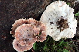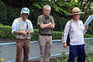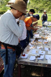 今年の夏季観察会は夏の様子を見たいということで秩父の美の山公園で行うことになった。確か昨年も少ないと書いたが今年も同様である。同定種は変形菌を除くと 今年の夏季観察会は夏の様子を見たいということで秩父の美の山公園で行うことになった。確か昨年も少ないと書いたが今年も同様である。同定種は変形菌を除くと4747種で昨年と同じである。今年は昨年と違い、種で昨年と同じである。今年は昨年と違い、77月いっぱい梅雨が続き、月いっぱい梅雨が続き、88月に入ってからも雷雨があったりで、降水量は十分なはずである。普通の年ならテングタケ、イグチ、ベニタケの仲間が列をなして出ていてもおかしくない時期なのにベニタケ属はヒビワレシロハツとドヨウハツ、テングタケ属もフクロツルタケとコテングタケモドキの2種のみである。また、出かたも一本または数本ポツンとあるだけで、列をなしていたり、菌輪をえがいていたりというような出かたは見られなかった。イグチ類も5種はあったが、コウジタケは誰も匂いが感じられなかったり、小さくて同定に難があったり、いろいろ苦労する状態であった。7月中旬にすでにチチタケが相当量出てしまったりしているのを考えると単に端境期に入ってしまった結果ではなく、異常気象の影響を受けての事のように思えてならない。ただ、昨年は9月に入ると食用価値の高いキノコ類が豊作だったので今年もそうなることを願いたい。観察会に美味しいキノコ月に入ってからも雷雨があったりで、降水量は十分なはずである。普通の年ならテングタケ、イグチ、ベニタケの仲間が列をなして出ていてもおかしくない時期なのにベニタケ属はヒビワレシロハツとドヨウハツ、テングタケ属もフクロツルタケとコテングタケモドキの2種のみである。また、出かたも一本または数本ポツンとあるだけで、列をなしていたり、菌輪をえがいていたりというような出かたは見られなかった。イグチ類も5種はあったが、コウジタケは誰も匂いが感じられなかったり、小さくて同定に難があったり、いろいろ苦労する状態であった。7月中旬にすでにチチタケが相当量出てしまったりしているのを考えると単に端境期に入ってしまった結果ではなく、異常気象の影響を受けての事のように思えてならない。ただ、昨年は9月に入ると食用価値の高いキノコ類が豊作だったので今年もそうなることを願いたい。観察会に美味しいキノコ((の同定標本の同定標本))が並び、「ああ、これは〇〇ですね。こうして食べるとおいしいですよ。」「いや、こんな食べ方もなかなか・・・」「なにを言っているんですか。こいつの食べ方は✕✕に決まっているじゃないですか。」などという喧々諤々の議論ができる事を期待したい。が並び、「ああ、これは〇〇ですね。こうして食べるとおいしいですよ。」「いや、こんな食べ方もなかなか・・・」「なにを言っているんですか。こいつの食べ方は✕✕に決まっているじゃないですか。」などという喧々諤々の議論ができる事を期待したい。