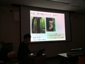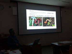 発表は以下の順で行われました。**素人が行った初めてのキノコ狩り 後藤 大**素人が行った初めてのキノコ狩り 後藤 大 今年沼田さんの紹介で入会した横浜市、大津のマンションにお住いのアウトドア大好きの方で、野で見たきのこ、美味しかったきのこ、見たいきのこ、食べてみたいきのこについて以下のキノコについて話されました。ハタケシメジ、ナラタケ、ナメコ、ツキヨタケ、ムキタケ、マイタケ、ナメコ、ヌメリスギタケ等。**2019年に出会ったきのこ 大久保 彦**2019年に出会ったきのこ 大久保 彦 アセハリタケ (川越市民の森)コガネキヌカラカサタケ(友人の温室の鉢の中)アシナガイタチタケ (自宅にゴミ処理場より戴いた堆肥の中より発生ナヨタケの系統か、少し異なる。少しピンク色になればナヨタケ、毎年発生。ムササビタケ 77月、上高地のカラマツ林、小谷村の塩の道など。ムラサキスギタケ 88月、日和田山のウッドチップ上に、ミドリスギタケに似ている種。キヒダマツシメジ、ダイダイイグチ、キツネハツ 小川町・77月ロウタケ ロウ状、肉質で草などより発生、草の上についている菌根菌かもしれない(福島)ブドウニガイグチ? 褐色に変化したので、東松山ヌメリコウジタケ 管孔が鮮黄色、8~9月日和田山に多い。マツカサモドキ マツカサキノコモドキは近縁種でない。キベニテングタケ 八ヶ岳合宿。幼菌の時は黄色いが成菌になると殆どベニテングタケと同じようになり区別が難しい。キアミアシタマドリタケ?管孔は初め孔口を白い菌糸が覆っているため白く見える。(大舘)他に、カブラテングタケ、ホウキタケ、シロヌメリイグチ、ドクヤマドリ、クリカワヤシャイグチなど**中央公園で一年を通して見たきのこ 岡田 久枝**中央公園で一年を通して見たきのこ 岡田 久枝 キクラゲ、ヒトクチタケ、モリノカレバタケの仲間、テングタケの仲間、ムラサキヤマドリタケ、アワタケ、ヘビキノコかキリンタケかドウシンタケ? シロホウライタケ?カミホウライタケ?(青木) チギレハツタケ、イボテングタケ、ハダイロハリホウライタケ? ウグイスハツ(大舘)、ハナオチバタケ、ザラエノハラタケ、ツチカブリ、キツネノカラカサ、ナカグロノモリノカサ、など。**今年出会った茸2019 大館 一夫**今年出会った茸2019 大館 一夫 主に都内の公園で見たきのこ、私も(藤野)大舘氏と同じなんですが、いくつになっても今まで疑問に思っていた方が突然ある本に出会ったおかげで解ったり、また新しいものを見つけたり、出会う喜びは変わらないですね。ヒメキシメジ モリノカレバタケ型で傘の中央が周辺に比べて濃い。襞が割と細かい。アカチャツエタケ 襞に赤褐色のシミができる。柄の先が細い。赤坂の森にてハダイロハリホウライタケ 針状のシスチジアの見られる個体もあるのでこれを以てハダイロホウライタケと同定できない。 赤坂の森ベニセンコウタケ 草地、芝生に良く見られる。柄が円形で先端部に行くに従い段々と黄色くなる。似た種にベニナギナタケがある。オトヒメアンズタケ アンズタケの名を冠しているが杏の香は無い。襞に連絡網が有り、奉仕中に顆粒が見られる。群馬の森の常緑樹下にてハイイロカレエダタケ カレエダタケとホウキタケの仲間の見分け方はホウキタケは根元より分岐しているのに対しカレエダタケの仲間は少ない。いずれにしても見分けは難しい。アカダマキヌガサタケ 卵が赤っぽく、切ると赤い、スカートの長さ網の形、多角形なのか、円形に近いのか、発生場所がおなじなのか、キヌガサタケとの違いがはっきりしない。今後の検討を要する。ニセホウライタケ イネ科の植物に良く発生しているのを見る。ハイイロオニタケ あまりお目にかからない。オオオニテングタケ 森林公園アカエノベニヒダタケ ウラベニガサ属、襞が白から淡紅色になり、柄は中空で赤くなる。ベニヒダタケに良く似る。コゲチャワタカラカサタケ ワタカラカサタケに似るが胞子の形が面白い。センボンサイギョウガサ シロシビンを含有するので、採取はしない。傘表面にクレーター状の皺が有り、襞の縁取りが白く、襞が白いまだら模様。ヤケアトツムタケ スギタケ属キナメツムタケ 赤坂の森イロガワリチャアセタケ 柄を裂くとやがて肉が赤変するのが特徴。一般にアセタケ属は胞子、シスチジアを見ないと同定はできないが肉眼で同定できる数少ない種。コブアセタケ カブラアセタケに似るが胞子に瘤があるのに対し、カブラアセタケは星形。 カサ周辺が裂け易い。モエギアミアシイグチ 小川元気プラザで時期になると沢山見られる。食すと幻覚症状が出る。クロホコリタケ ホコリタケの仲間では割と大型で刺状の外皮で覆われ刺の採れた跡が白く残るのが特徴。ヒメホコリタケ 胞子に柄がある。 胞子をつくる場所と基部が分かれるが基部が小さいとはっきりする。**キノコ狩りの安全対策 村田 紀彦**キノコ狩りの安全対策 村田 紀彦 村田氏が自身の経験を通して話されました。 蜂 特にスズメ