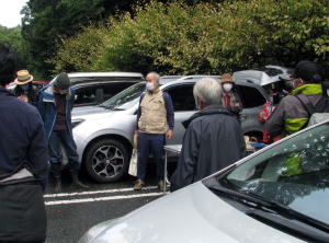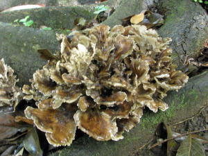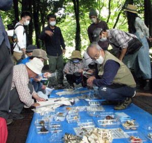 台風14号の北上が観察会の日にぶつかるのではないかとヤキモキさせる天気が続きましたが 台風14号の北上が観察会の日にぶつかるのではないかとヤキモキさせる天気が続きましたが当日の朝、集合した時は多少の小雨が降っていたところ歩き始める頃にはやんできました。当日の朝、集合した時は多少の小雨が降っていたところ歩き始める頃にはやんできました。 今回、テレビ朝日の取材もあり、その方達より発生しているキノコは採る前に是非撮影をさせていただきたいとお願いされました。園内を観察しながら歩くと8~9月の猛暑日が続いたせいか? 今回、テレビ朝日の取材もあり、その方達より発生しているキノコは採る前に是非撮影をさせていただきたいとお願いされました。園内を観察しながら歩くと8~9月の猛暑日が続いたせいか?キノコの種類と量が少ないと感じましたが園内の一部にナラタケの発生が多く見られた場所がキノコの種類と量が少ないと感じましたが園内の一部にナラタケの発生が多く見られた場所があり早速テレビ朝日の取材陣に連絡をしました。あり早速テレビ朝日の取材陣に連絡をしました。他にもマイタケが2株見られ、それも撮影されました。他にもマイタケが2株見られ、それも撮影されました。