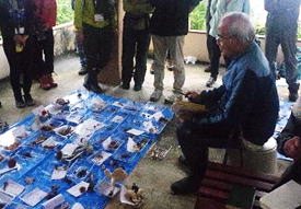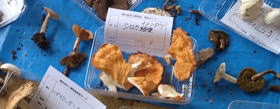 キノコ観察会報告キノコ観察会報告今年も昨年以上に暑い日が99月末ごろまで続き、やっとここに来て最低気温が2020度を下回るようになり秋の気配が感じられるようになり、また雨も適度に降っているのでキノコの発生には丁度いいタイミングではないかと思いました。当日の天気予報は曇りということでしたが時々霧雨が降って、ちょっと衣服が濡れましたが、まずまずの観察日和となりました99時3030分頃から受付が始まり、本日の日程やコースの説明および諸注意(ハチやヘビ、滑りやすい斜面等)があった後、1010時頃から各自観察採取に散らばりました。1212時頃、採集を終え収穫したキノコを持った参加者が三々五々と、頂上付近の33階建て展望台の11階部分に設定した同定会場に集まって昼食となりました。11時頃からブルーシートを広げて採集キノコを並べ、会長を中心に同定作業を始めましたが、今回採取されたキノコがかなり大量であった為、科ごとの仕分けができませんでした。22時4040分頃から名前が付けられた採集キノコについて、福島会長から担子菌類の、会員の板垣さんから子嚢菌類の詳しい説明がありました。また参加者から色々と質問があり、楽しい雰囲気で同定会が33時2020分頃終了し、後片付けをして、今回の観察会が終了しました。 今回は、ここ数年では最多の2727名の参加となり、老若男女様々な目でキノコを探した結果、採集キノコは別紙にまとめましたが、なんと120120種でした。しかも時間が無かったのでブルーシートの上にはまだ多くのキノコが未同定のままです。目視確認なので、完全に正確とは言えませんが、本当に様々な種類がありました。特に今回は子嚢菌類が2020種と今までの観察会では考えられない種数でした、子嚢菌好きの私としては大変嬉しいかぎりです。また、オレンジ色のマスタケと思われていたものがシロカイメンタケと同定されてビックリされた方もおられました。腹菌類もエリマまた、オレンジ色のマスタケと思われていたものがシロカイメンタケと同定されてビックリされた方もおられました。腹菌類もエリマキツチグリやチャダイゴケの仲間、コイヌノエフデなど多く発生していました。